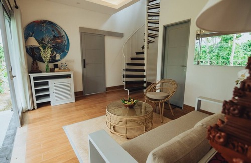 Incorporate modern and Balinese architecture design, the villa is inspired by the Traditional rice barn called ‘the lumbung’ which is firmly built with the calming wood element. The living room on the ground level is adapting an open living concept completed where the plunge pool and long river pool are attached to its terrace, while on the upstairs, the bedroom is perfectly set in the wooden curved roof with the balcony allowing more privacy.